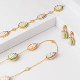 Embrace romance and elegance with our Country Flower Bracelet, featuring cameos with delicate floral designs in pink, lilac, and natural green. Pair it with the matching satuoir and drop earrings for a sweet and stylish touch.