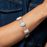 This double-chain bracelet features porcelain cameos of dancing goddesses, framed by sparkling white stones. Part of the Tesoro Collection, known for its soft pink and lilac hues, it blends antique elegance with contemporary design for a timeless appeal. Complete the look with the matching sautoir, rings, and earrings, all showcasing the collection's distinctive charm and originality.
