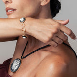This elegant bracelet features a gold circle-link chain adorned with porcelain cameos depicting the profile of a woman from ancient Rome. refined and contemporary piece, it echoes the classical tradition of portraiture as interpretations of the soul—much like today’s modern selfies.