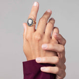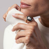 The Woman in Ancient Rome Ring showcases a stunning porcelain cameo depicting the profile of a woman from ancient Rome. The cameo, with its striking black and white design, is elegantly set in a meticulously crafted mount of sterling silver plated with gold. As part of the Roma collection, this ring highlights the belief that in ancient times, portraits were not just physical reproductions but reflections of the soul.