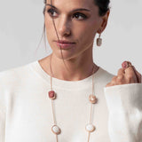 This stunning sautoir features alternating terracotta and white porcelain cameos, depicting a woman adorned with a fruit and flower hair ornament, symbolizing wealth and vitality, paired with a geometric motif inspired by Baroque architecture. Set in rose gold-plated frames with intricate designs that mirror the cameo on the reverse, this necklace is a masterpiece of detailed craftsmanship.